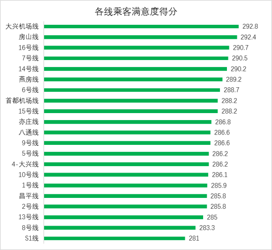 北京市轨道交通乘客满意度总体较好,各线路满意度均在93%以上。乘客满意度评分方面,大兴机场线、房山线、16号线、7号线、14号线满意度较高,得分在290分以上;S1线、8号线满意度相对较低,满意度得分在285分以下(详见图3)。