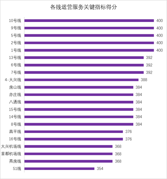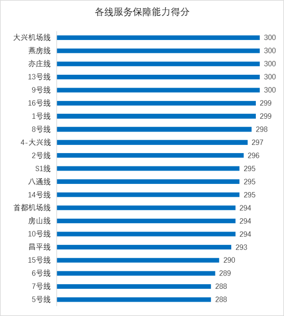 评价结果显示,大兴机场线、燕房线、亦庄线等19条线路服务保障能力得分在290分(含)以上;6号线、7号线、5号线3条线路服务保障能力得分相对较低,在290分(不含)以下(详见图4)。