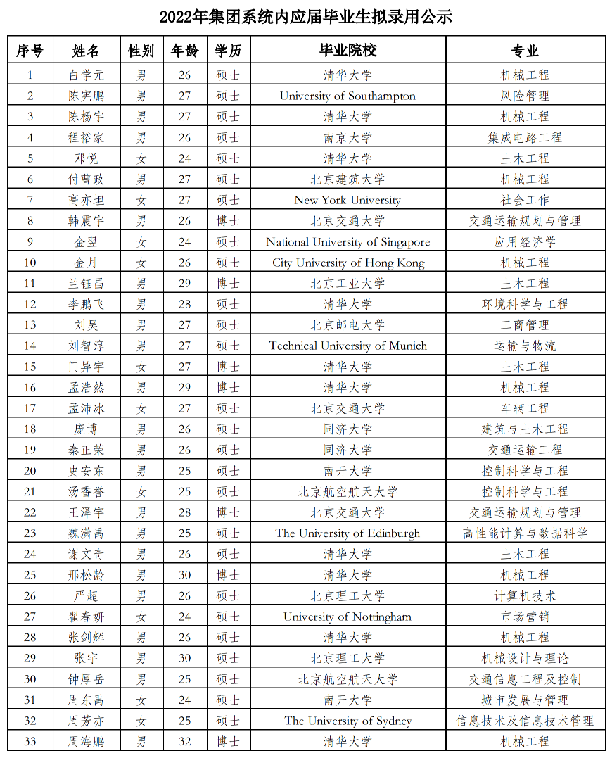 为进一步加强高校毕业生招聘工作的信息公开、过程公开和结果公开,自觉接受社会监督,根据《人力资源和社会保障部关于国有企业招聘应届高校毕业生信息公开的意见》(人社部发〔2014〕79号)、《关于印发<北京市引进非北京生源毕业生工作暂行办法>的通知》(京人社毕发〔2018〕37号)等文件有关要求,经过笔试、面试等程序,初步确定录用白学元等33名应届毕业生,现将2022年拟录用应届毕业生情况予以公示,公示期为7天(2022年7月15日—7月21日)。拟录用应届毕业生名单如下(按姓名首字母排序):北京市引进非北京生源毕业生工作暂行办法>